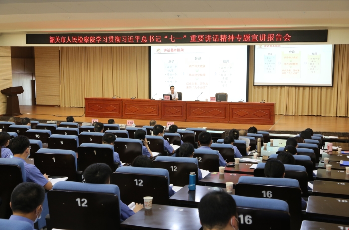 沈明河在主持报告会时强调,学习好宣传好贯彻好习近平总书记“七一”重要讲话精神,是当前和今后一个时期的首要政治任务,全市检察机关要以深入学习贯彻习近平总书记“七一”重要讲话精神为契机,进一步推动党史学习教育往深里走、往实里走,践行初心、担当使命,在依法履职办案中践行习近平法治思想,通过检察履职厚植党执政的政治基础;要坚决响应习近平总书记号召,增强“四个意识”、坚定“四个自信”、做到“两个维护”,锻造一支政治过硬、本领高强的检察铁军,以时不我待、奋勇争先的精气神不断开创韶关检察工作新局面,以检察工作高质量发展服务保障经济社会高质量发展。
